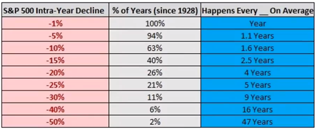 Market corrections, while often unsettling, are not anomalies. In fact, intra-year declines of 5% or more occur almost every year, and a 10% decline happens in nearly two out of every three years. More substantial corrections, such as bear markets, are less frequent yet still part of the normal market cycle: a 20% decline occurs on average every four to five years, while a 30% drop occurs roughly once every nine years (1928 to present). 1